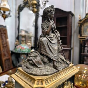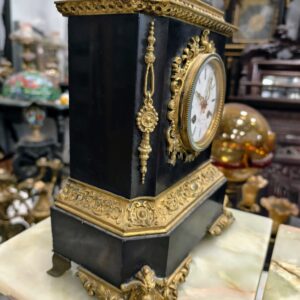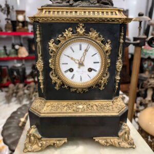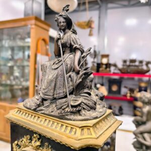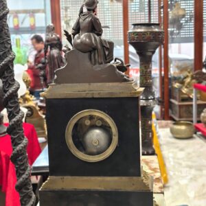 Đồng hồ tượng, xuất xứ Pháp. Phần thân là các chi tiết đồng lacke vàng kết hợp với đá đen, phía trên là tượng cô gái bằng đồng được làm cực kỳ tinh xảo.