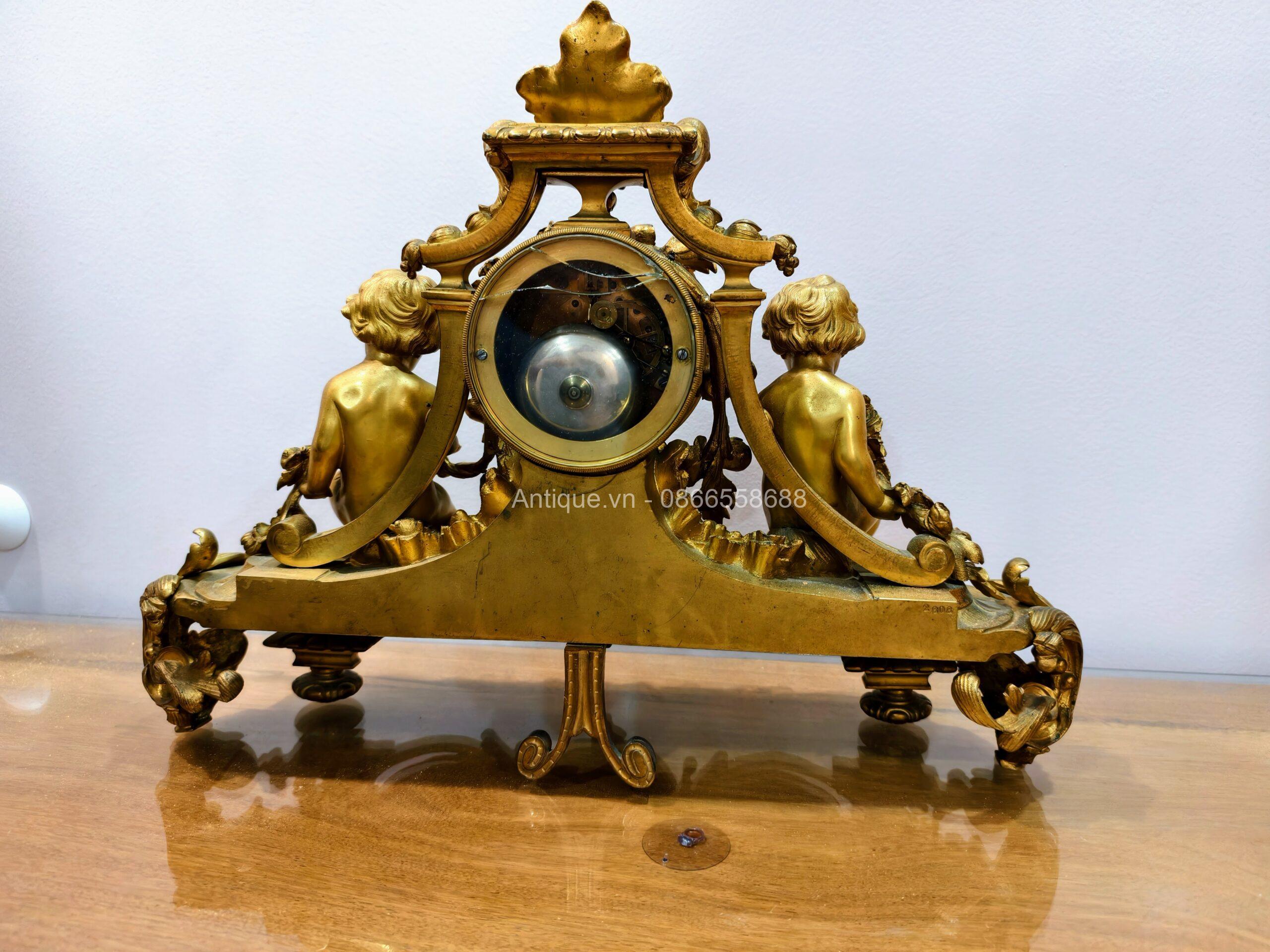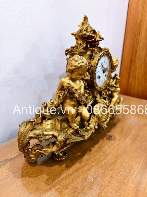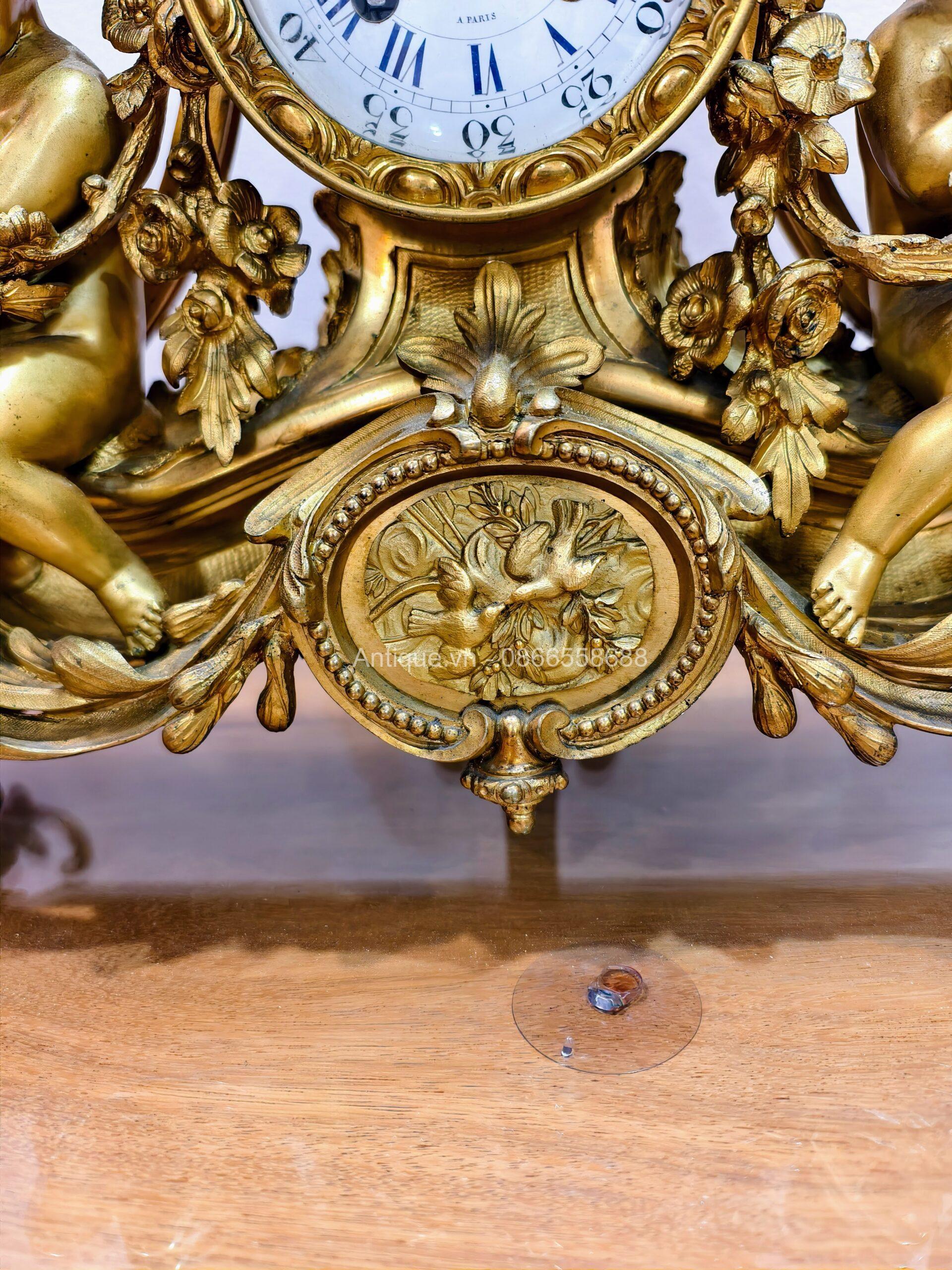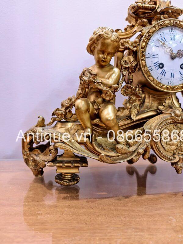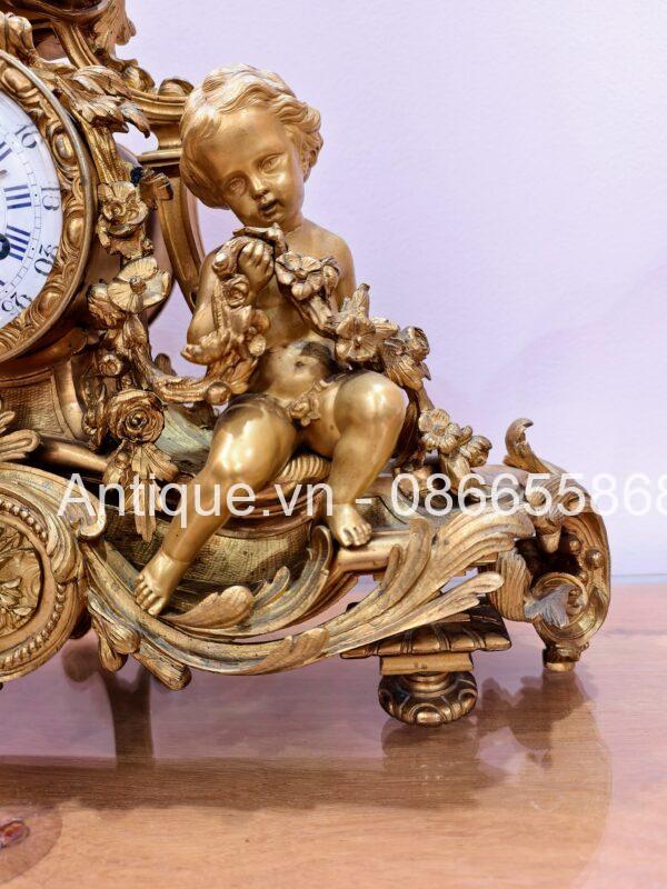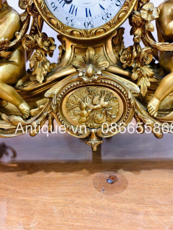 Đồng hồ tượng, xuất xứ Pháp. Đồng hồ với các họa tiết bằng đồng được chế tác cực kỳ tinh xảo, hai bên là hai thiên thần cầm hoa, chính giữa là cặp chim biểu tượng sự an lành.