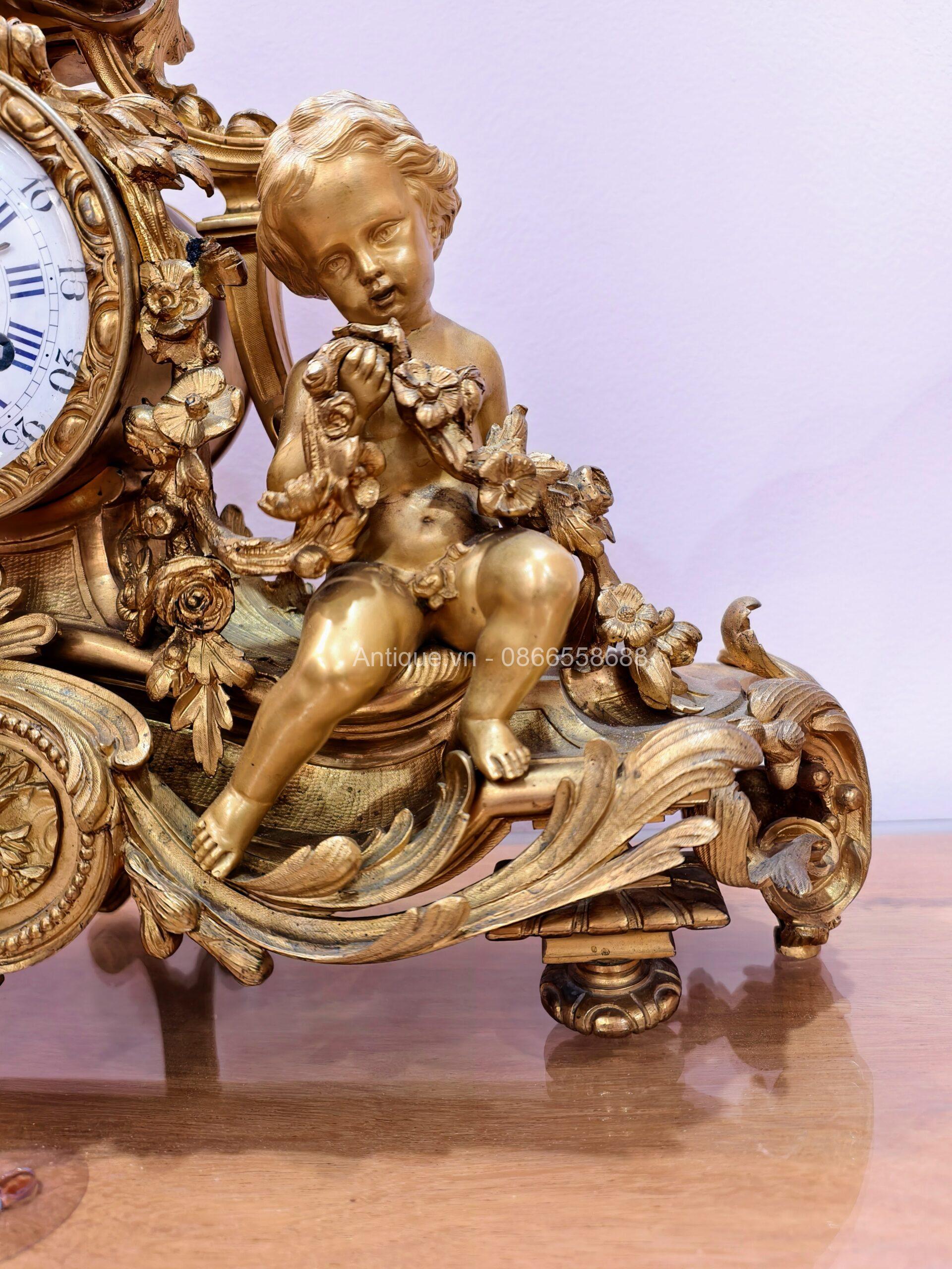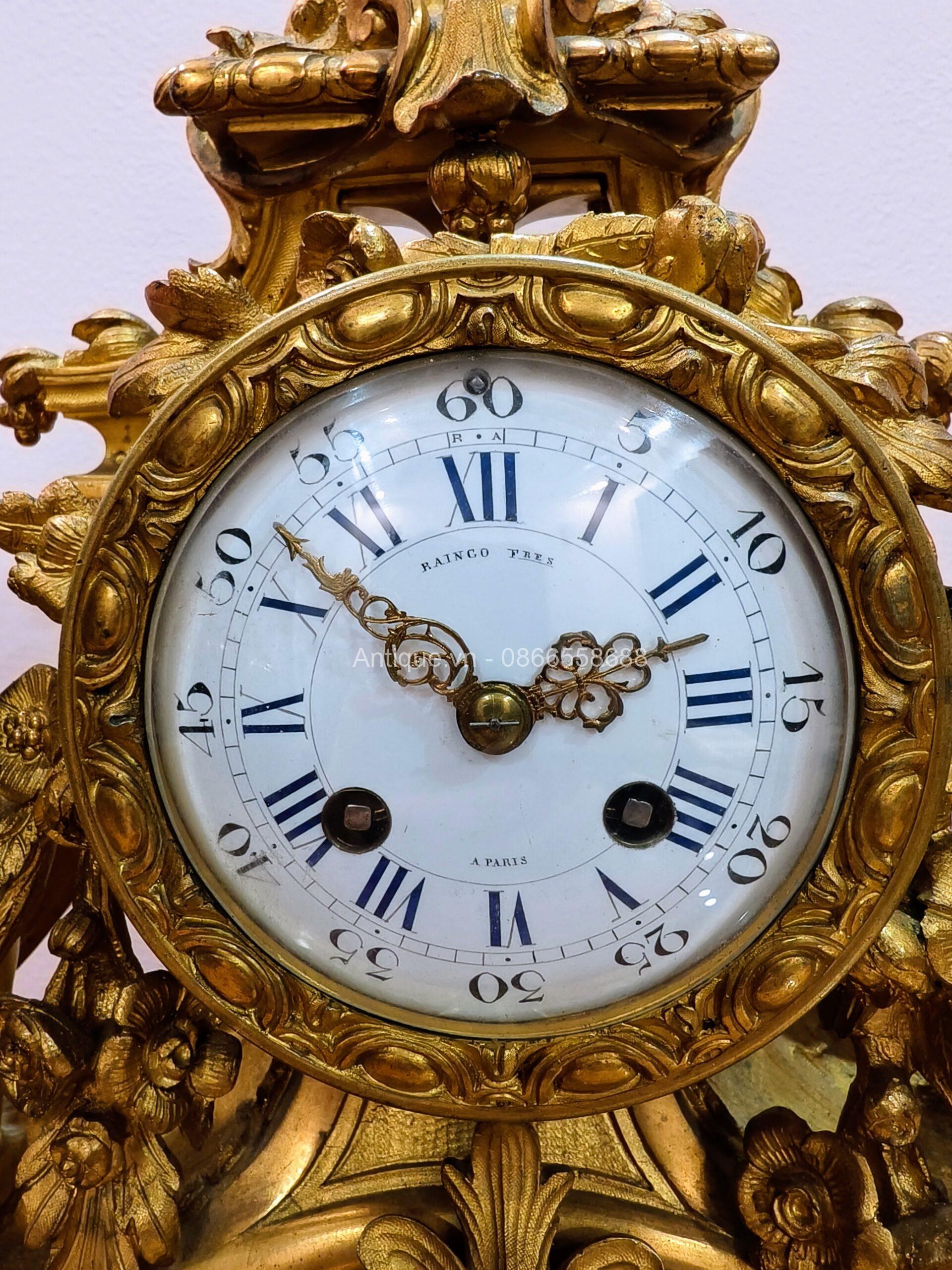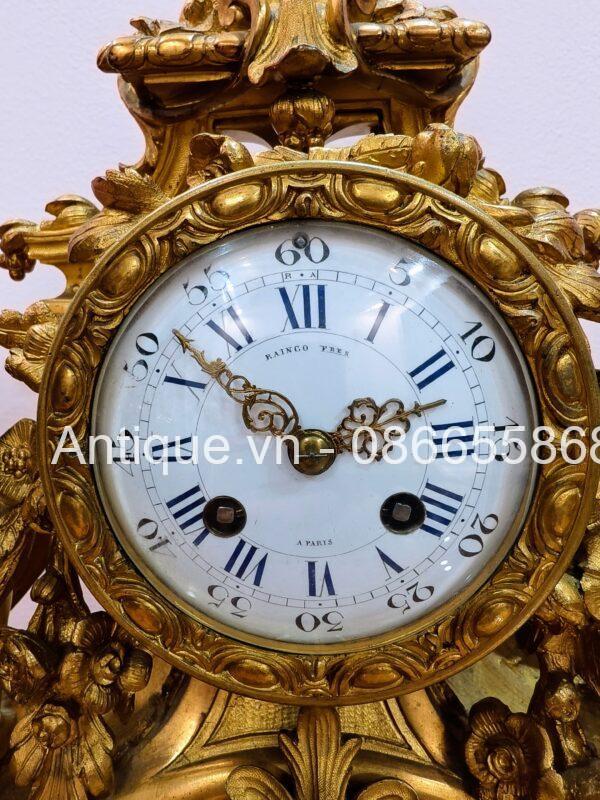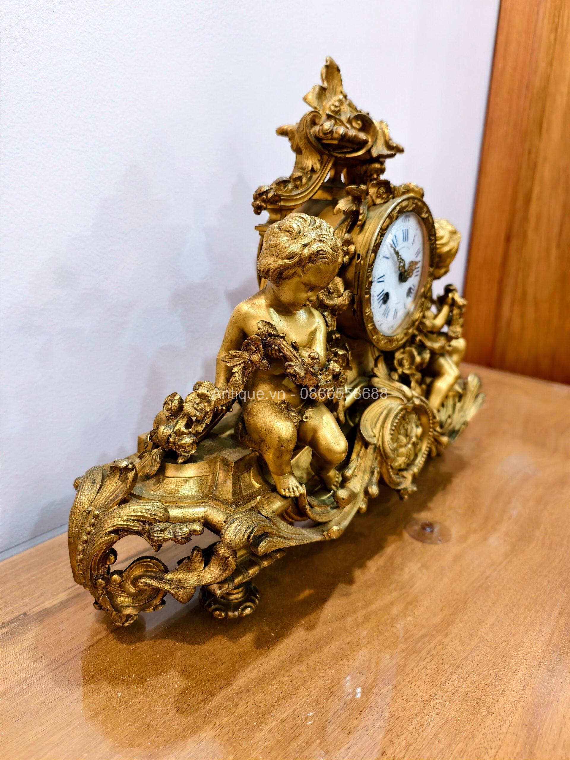 Đồng hồ tượng, xuất xứ Pháp. Đồng hồ với các họa tiết bằng đồng được chế tác cực kỳ tinh xảo, hai bên là hai thiên thần cầm hoa, chính giữa là cặp chim biểu tượng sự an lành.
