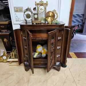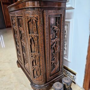 Chiếc tủ rượu xưa, hàng Nhật xuất âu. Tủ được trạm nổi 3 mặt với họa tiết cây trúc. Tủ có 6 cánh cửa, chính giữa là ngăn lớn nhất đựng rượu, 2 bên để ly và chén rất tiện.